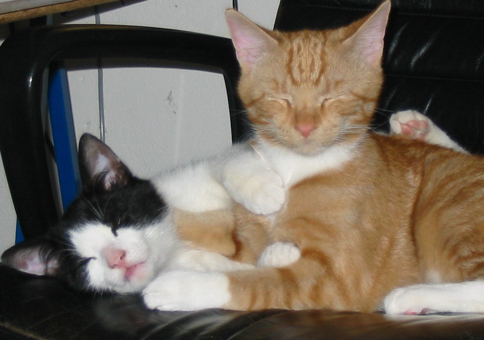 Wie ich sehe, scheine ich hier ja in guter Gesellschaft zu sein. Ich habe auch zwei Katerchen-sie heißen Elmo und Grobi. Sie sind beide zwei Jahre alt und ich hab sie aus'm Tierheim. Grobi ist schwarz-weiß und Elmo rot-beige getigert. Wenn ich mir die Bilder so anschaue könnte Grobi mit der Katze von oemchenli verwandt sein.