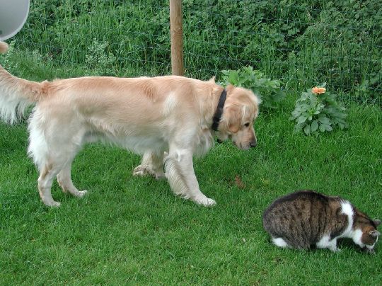 Herr Kater Lucky hat mal wieder eine Maus geliefert. Mit der noch ein wenig im Garten gespielt. Herr Rüde Billy hat sich das aus nächster Entfernung höchst interessiert schwanzwedelnd betrachtet.