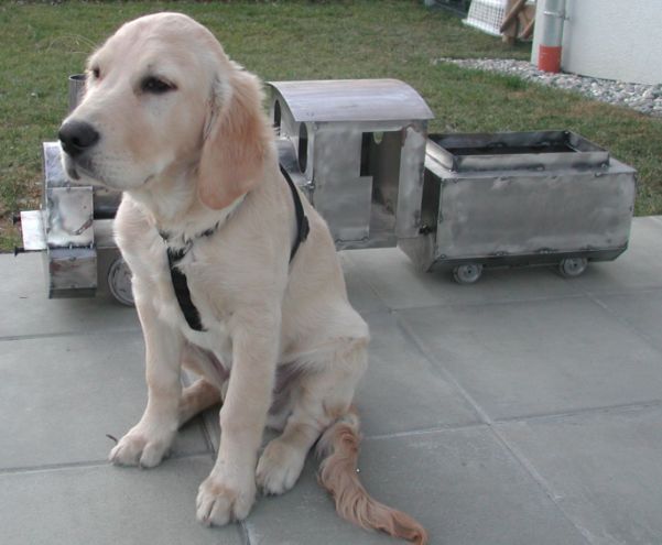 Das ist mein Billy letzten Donnerstag. Im Hintergrund die selbergebastelte Lok, die mir meine Kollegen zur Hochzeit geschenkt haben. (Insider finden im Hintergrund unscharf auch das erste Loch, das Billy gebuddelt hat...)
