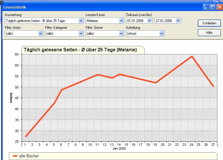 Aber was mich noch irritiert: Die "Durchschnittlich gelesene Seiten pro Woche/Monat etc. Grafik verstehe ich nicht so ganz, ich dachte eigentlich, da müsste ein fester Betrag rauskommen, aber der Wert ist ja jeden Tag anders. Kann mir jemand erklären, wie ich die Grafik zu deuten habe? *auf dem Schlauch steht*