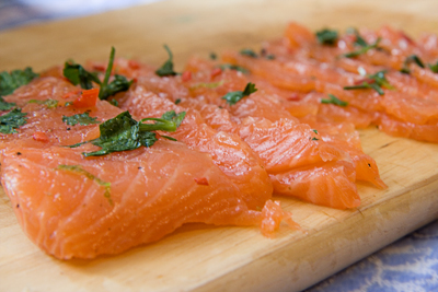 es gab nämlich selbst gebeizten Lachs, mal auf asiatische Art mit Chili und Koriander. meine Güte, ist der wieder gut geworden! ich könnte das Ganze Riesenstück auf einmal essen *njam*