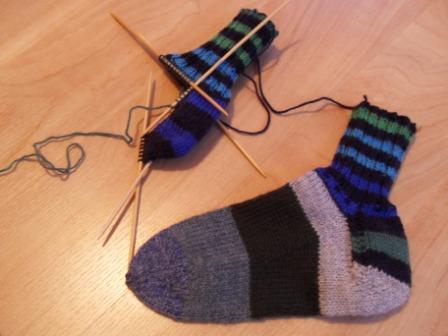 Zu guter Letzt noch die Reste-Kindersöckchen, die gerade in Arbeit sind. Es sollten eigentlich Babysöckchen werden, aber ich habe noch zu viele Maschen genommen. Die Reste stammen noch aus der Sammlung meiner Oma, die eine sehr fleißige Sockenstrickerin war.