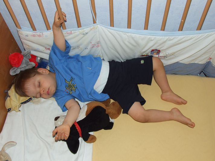 hab noch mal 2 fotos angehangen - david beim "papa abschlecken" im urlaub und dann beim ratzen zwischen all seinen plüschfreunden in seinem heia bett