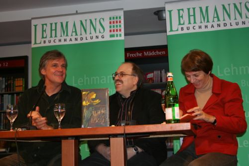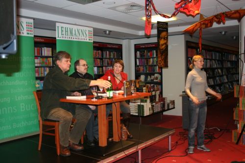 Zwischen den vorgelesenen Abschnitten beantwortete Jörg Kastner (ja, obwohl er nicht selbst las hatte er doch etwas zu tun) die Fragen von Margarete von Schwarzkopf zu seiner Arbeitsweise, wie er eine Geschichte anfängt, seine Recherche und vieles mehr. So hörten wir nicht nur markante Textstellen aus seinem Roman, sondern konnten auch ein wenig "hinter die Kulissen" schauen, wir bekamen sozusagen die "special edition" mit dem "making of", und das auch noch life!