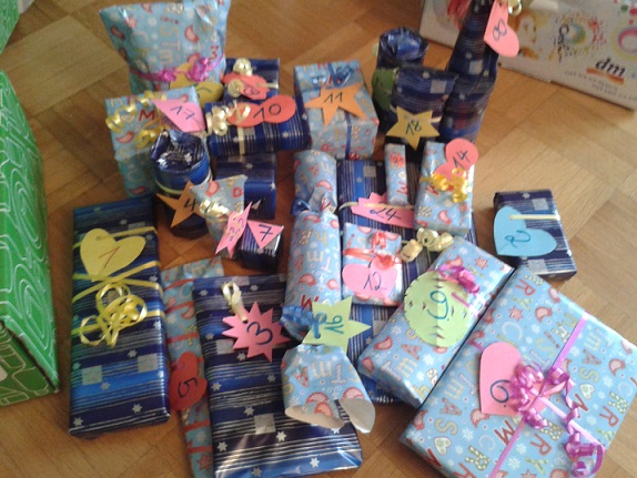 Wir haben kleine Dinge gekauft und einfach in Geschenkpapier eingepackt und das alles kommt dann in eine große Schachtel. Zum Teil haben wir noch was dazugeschrieben.