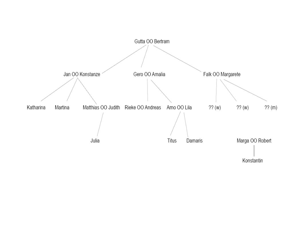 Am Anfang wäre ich auch für einen Stammbaum dankbar gewesen, vielleicht male ich mir noch selbst einen, aber eigentlich ist es auch nicht sooo wichtig, die Beziehungen der "gegenwärtigen" Generation untereinander ist ja relativ einfach.