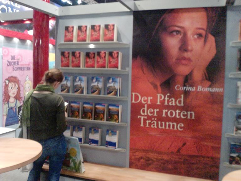 So steht "Der Pfad der roten Träume" übrigens auf der Buchmesse am Ueberreuter-Stand. Das Plakat ist einfach toll! Und die anonyme Dame im Bild hielt tatsächlich eins von meinen Büchern in den Händen. Ein tolles Gefühl für die Autorin!