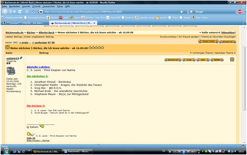 Gerade war ich dabei beim Thread Meine nächsten 5 Bücher die ich lesen möchte einen Beitrag zu erstellen. Nach dem Absenden wurde dieser mir auch angezeigt.