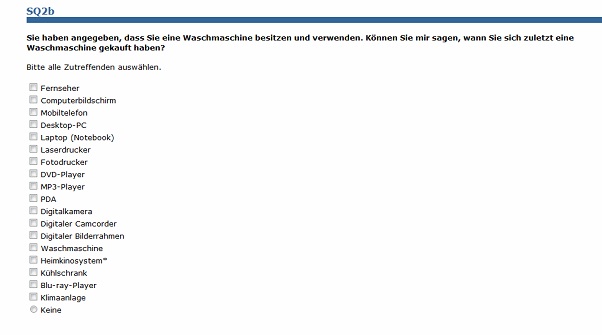 Oft genug werde ich auch nach der Frage "Haben Sie innerhalb der letzten Wochen an einer Befragung über verpackte Süßwaren teilgenommen?" rausgeschmissen. Und die kommt so oft, dass ich inzwischen gemerkt habe, dass ich sowohl bei "Ja", als auch bei "Nein" rausgeschmissen werde...