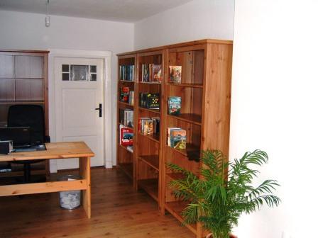 Richtig, das vierte Regal steht hinter dem Schreibtisch und ja, es gibt natürlich eine Leseecke, die auch als Gästeschlafgelegenheit dient (das jetzige GäZi wird zum KiZi