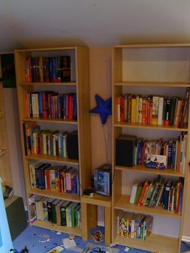 Neben den zwei Regalen, hinterm Schrank, steht noch ein (unaufgeräumtes) Regal und bei meinem Vater habe ich auch noch drei so große Regale.