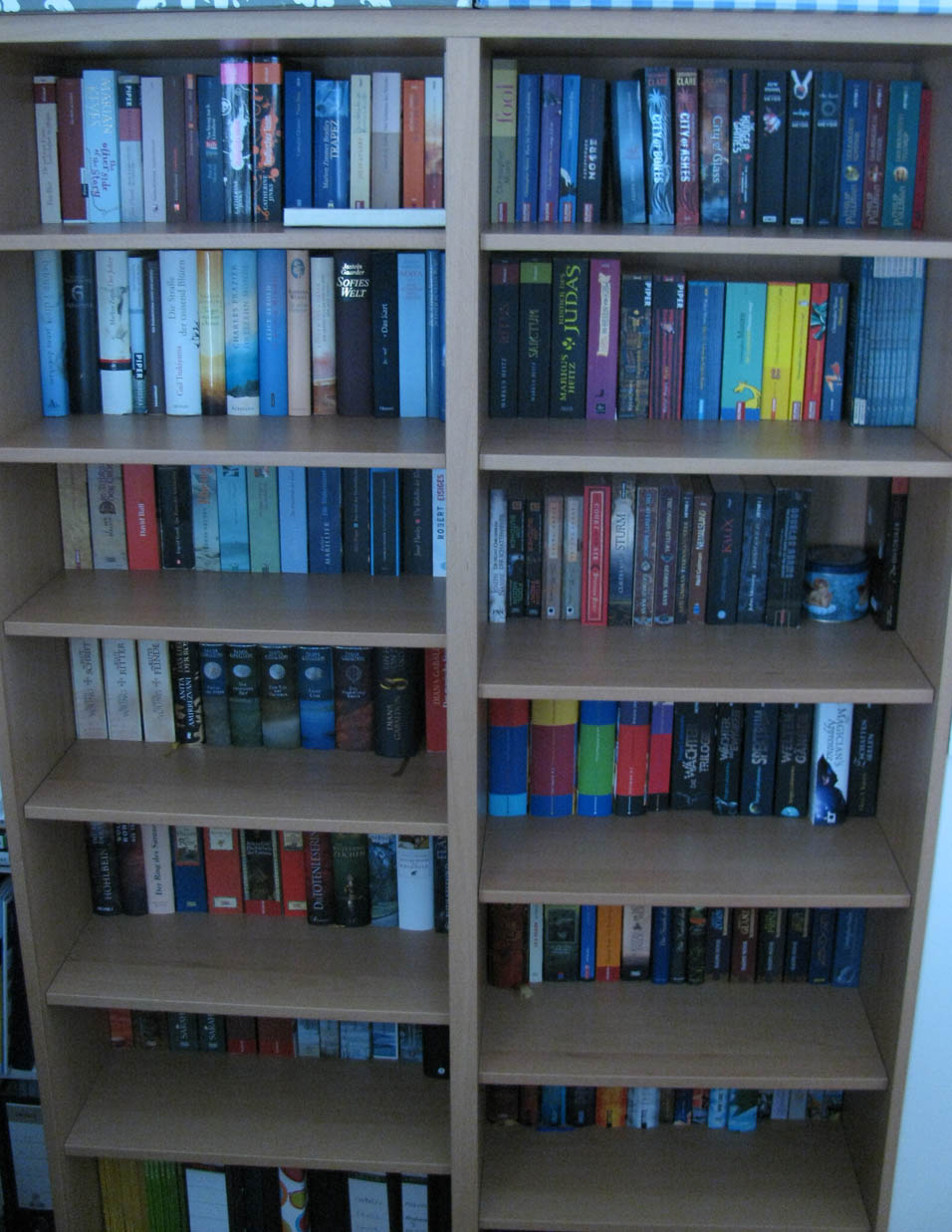 Jetzt ist auch alles schön geordnet, ein Regal Fantasy, ein Regal Belletristik und Historisches, ein Regal Krimis und Thriller.
