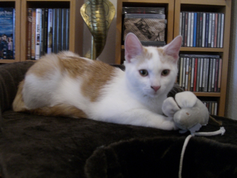• Stimmt schon. In den ersten Tagen als er kam war jede Bewegung von Anlaß sich verschreckt wieder zu verdrücken. So langsam wird er neugieriger und wenn er ganz gut drauf ist lässt er sich auch mal hinter den Ohren kraulen :grin