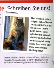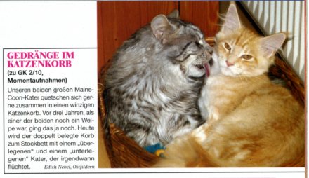 Unsere Katern Cooniebert und Yannick in "Geliebte Katze", Ausgabe Juni 2010. Und Cooniebert solo in der Zeitschrift "DAHEIM in Deutschland", Ausgabe Juni/Juli 2010.