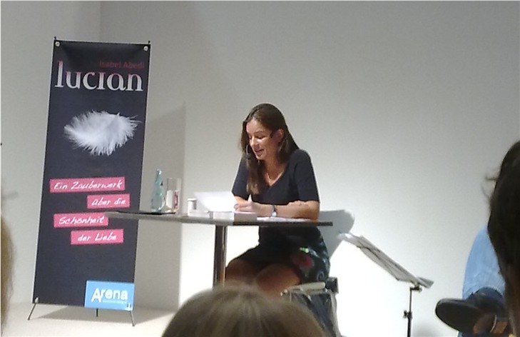 Isabel Abedi durfte dieses Jahr – statt am Arena-Stand – im Forum lesen, was in Anbetracht des großen Ansturms auch nötig war. Obwohl wir eine gute viertel Stunde vorher da waren, konnte ich nur noch einen Platz auf dem Boden im Mittelgang ergattern. Obwohl die Veranstaltung ihrem Jugendbuch „Lucian“ galt, waren auch sehr viele jüngere Kinder anwesend, die sie von ihren „Lola-Büchern“ kannten.