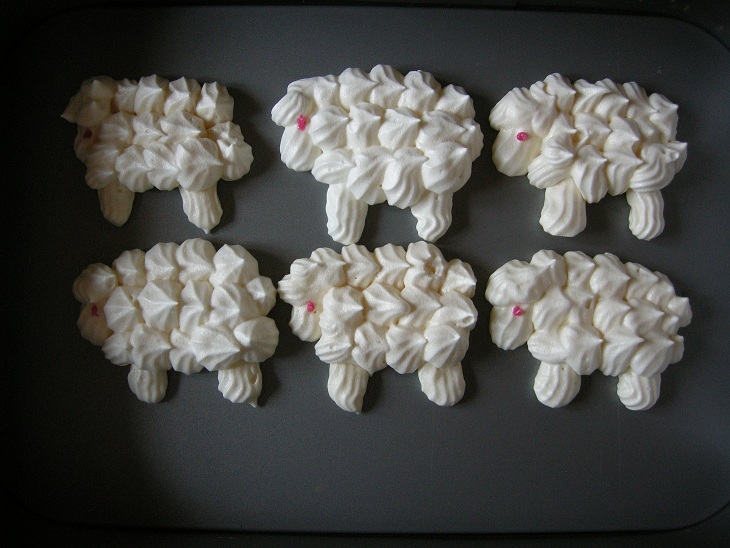 In eine Spritztüte füllen und Lämmchen auf Backpapier spritzen.