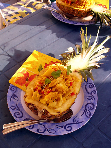 Ananaswürfel unterheben. Mit Fischsauce und Chilipulver süß-scharf abschmecken. Dann in die Ananashälften füllen und mit Korianderblättchen garniert servieren.