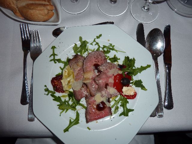 Wir konnten mehr oder weniger einen gemeinsamen Tisch ergattern und nach einem Aperitiv eröffnete Helmut Kammerer den Abend. Der Küchenchef erklärte die Speisenfolge und dann wurde auch schon der erste Gang, Roastbeef "italienisch", aufgetragen. Als erster Zwischengang stand eine Lesung von Charlie auf dem Programm, da sie aber an diesem Tag ja auch Geburtstag hatte, gab es erst mal noch eine kleine Ansprache und einige Präsente. Auch die Eulen hatten zusammengelegt und überreichten eine Überraschungstüte. Charlie las dann aus "Die zwölfte Nacht" und zwar den beginn der zweiten Nacht, in dem es erst ziemlich viel um Essen geht und später getanzt wird. Dazu gab es eine musikalische Einlage, einen Tanz auf der Blockflöte, das fand ich sehr passend. Die Stelle war von Charlie sehr gut gewählt und machte mir sofort Lust, das Buch nochmals zu lesen.