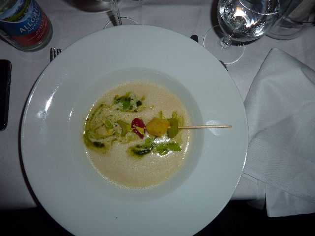 Danach gab es wieder etwas zu Essen, nämlich Sellerie-Kartoffelsuppe, die sehr fein war. Nachdem alle Teller wieder weggeräumt waren, las Titus die Eingangssequenz aus "Die Jesuitin von Lissabon" und erzählte noch ein bisschen über die Motivation der Protagonisten und seine Brüder, sehr witzig und locker. Im Anschluss wurde der Hauptgang serviert, gefüllte Maispoulardenbrust mit Rosmarin-Kartoffelstrudel, alles sehr lecker.