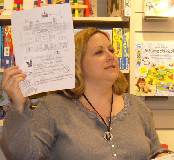 Besonders gerne hat sie aber die Situationen, in denen Xemerius vorkommt vorgelesen, weil er so herrlich frech ist, wo Gwendolyn es nicht sein darf. Kerstin brachte das Publikum immer wieder zum Losprusten, aber auch oft zum Staunen, wenn sie die selbstgemalten Skizzen und Stammbäume zeigte oder die herrlichen Kostüme, die sie alle im Internet recherchiert hat, um alles möglichst authentisch zu beschreiben, wenn Gwendolyn und Gideon die Zeitsprünge machen.