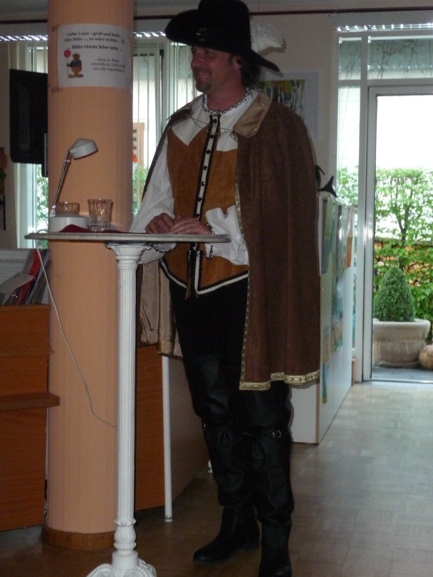 Wer eine wirklich gute Lesung genießen möchte, dem kann wirklich ans Herz legen, sich die von Richard Dübell anzuhören und vor allem auch anzusehen, wenn sich die Gelegenheit ergibt. Ich hatte mich ja schon seit Wochen darauf gefreut und so habe ich mich dann heute mit zwei Userinnen des Lesejury-Forums auf den Weg zur Buchhandlung Ludwig im Kölner Hauptbahnhof gemacht. Nachdem wir die besten Plätze in der ersten Reihe geentert hatten und ins Gespräch vertieft waren, tauchte dann gut 20 Minuten vor der Lesung der Autor höchstpersönlich auf - Inkognito! Enttäuschung wollte sich breit machen, hatten wir doch damit gerechnet, einen in ein historisches Kostüm gewandeten Autor zu sehen. Richard nahm uns dann schnell unsere Bedenken "Ich bin eigentlich noch gar nicht da, tut einfach so, als würdet Ihr mich nicht sehen" sprachs und verschwand wieder. Pünktlich um 19:00 Uhr tauchte er dann wie versprochen in Wams, Mantel, verzierter Hose, Reiterstiefeln und befedertem Hut auf. Es folgte eine bild- und lehrreiche Erkärung, was es mit den einzelnen Kleidungsstücken auf sich hat, welche Funktion diese hatten und vor allem, was die Farbe der Hutfedern zu bedeuten hat. Die seines Hutes sind weiß und das war damals, wie auch heute noch, ein Zeichen von Neutralität.