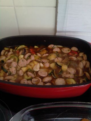 Gemüsebratwursttopf, hat sich bei der Zubereitung so ergeben. War lecker gibts morgen den Rest.