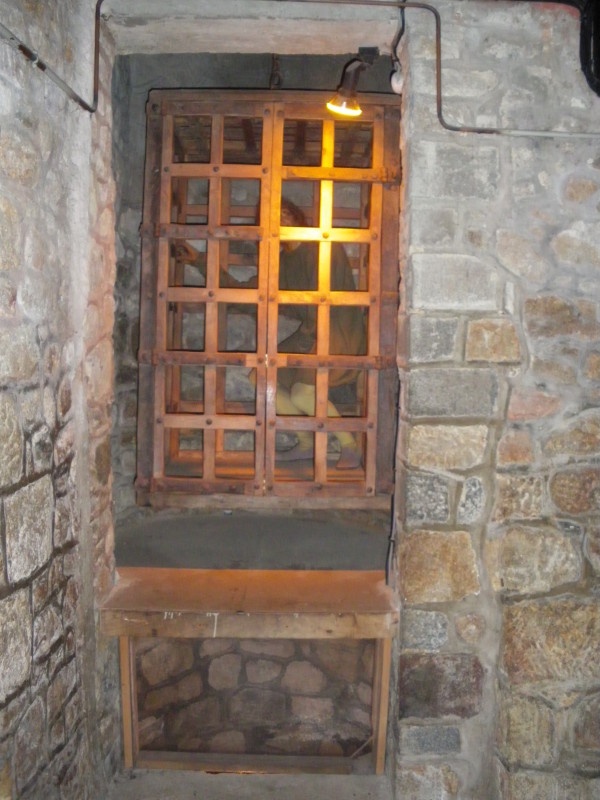 Auf dem Bild muss man etwas genauer hinsehen, aber dann erkennt man, dass dieser Holzkäfig aufgehängt ist, so wie er es einst im Gefängnis war.