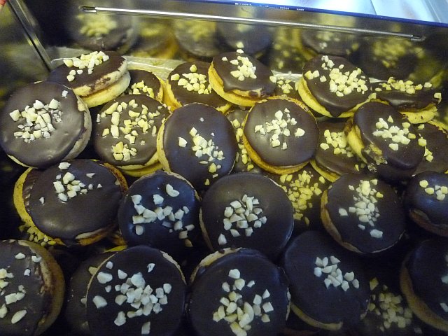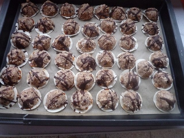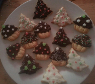 Gestern habe ich Haselnuss- und Vanilleplätzchen gemacht und diese mit Schokoguss bepinselt.