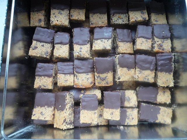 Bei 200 Grad 15-20 Minuten backen.Auf dem Blech erkalten lassen und dann in Dreiecke schneiden. Die Spitzen mit Schoko Glasur bestreichen oder eintauchen.