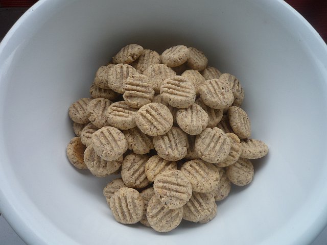 Alles verkneten und dann Kugeln formen, Mit der Gabel leicht eindrücken ( ergibt das Muster )