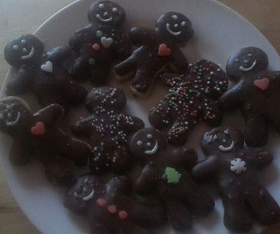 Heute habe ich kleine Lebkuchenmänner für die Nikolaustüten meiner Nichten gemacht. Habe einfach zu meinem Grundteig Lebkuchengewürz gekippt. In einen Teil habe ich noch Orangeat geknetet und daraus Taler gemacht.