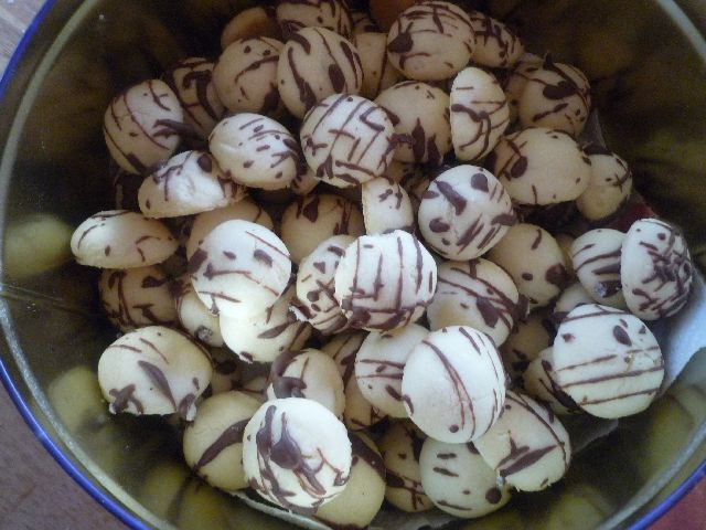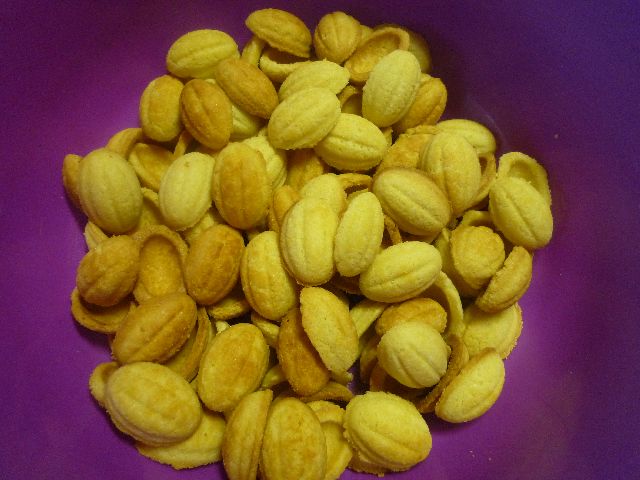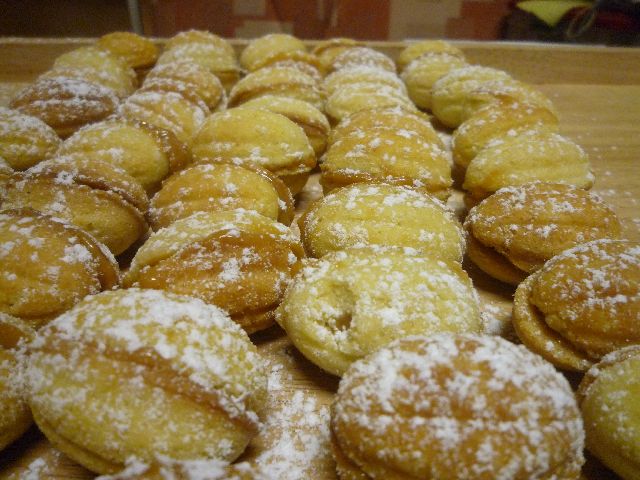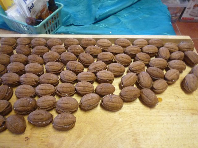 Außerdem habe ich mal meinen Maker wie immer er heisst ausbropiert und Nüsse gebacken. Gefüllt sind sie mit Milchmädchen ( karamellisierte Dosenmilch ) und einer halben Walnuss -