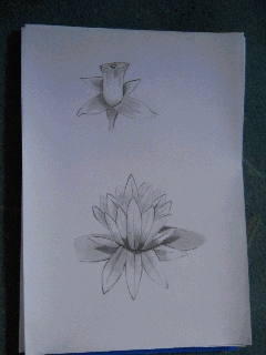 Die beiden Blumen habe ich aus meinem Zeichenbuch abgemalt. Da stand, wie man die am leichtesten skizziert, schattiert, etc. Ich habe einerseits versucht, mich ein bisschen an diese Anleitung zu halten, habe aber gleichzeitig versucht, meine eigene Blume zu malen.