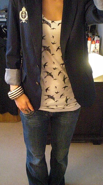tagsüber - blaues top (etwa der farbton wie die smilies hier links ;-)), blau-türkis gemusterter pulli, weisse jeans bootcut mit asiatischen stickereien, altrosa gürtel, dunkelblaue stiefeletten, bordeauxfarbene jacke und (wie fast immer) 3 ringe.