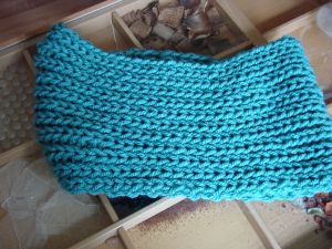 Gestrickt wird der Schal von der Schwanzspitze zum Kopf, mit kraus rechten Maschen für den Körper und glatten rechten für die Zacken. Die sind übrigens sehr einfach konstruiert: man nimmt in den Hinreihen jeweils vor und hinter der Mittelmasche eine Masche zu, bis die gewünschte Zackenhöhe erreicht ist, und kettet die Maschen dann mit einem Three-Needle-Bindoff wieder ab (dazu wird die Mittelmasche auf eine dritte Nadel gelegt, die anderen beiden parallel gehalten).Ich weiss was ein Three-Needle-Bindoff ist und schließe so meistens meine Pullover. Aber in dem Fall weiss ich nicht, wie das gehen könnte. Was mach ich mit der Mittelmasche, die cih auf die dritte Nadel gelegt habe. Abstricken (vorher oder nachher), nicht abstricken (geht ja wohl nicht). Ich hätte einfach in jeder Reihe, in der ich an der Zacke was abnehmen will 3 Maschen zusammengestrickt (2 M rechts verschr. abheben, 1 M r abstricken und die beiden Maschen drüberheben)