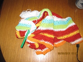 • Ich bin gerade dabei, Socken in Größe 47 zu stricken. Das ist ein Mamutprojekt für meine Nachbarin (ein Verwandter ist in Afganistan bei der Bundeswehr und braucht für den Winter warme Socken). Eine Socke ist schon fertig. Puh! Da ich meistens nur abends oder in der Mittagspause stricken kann, dauert das schon ein bißchen.