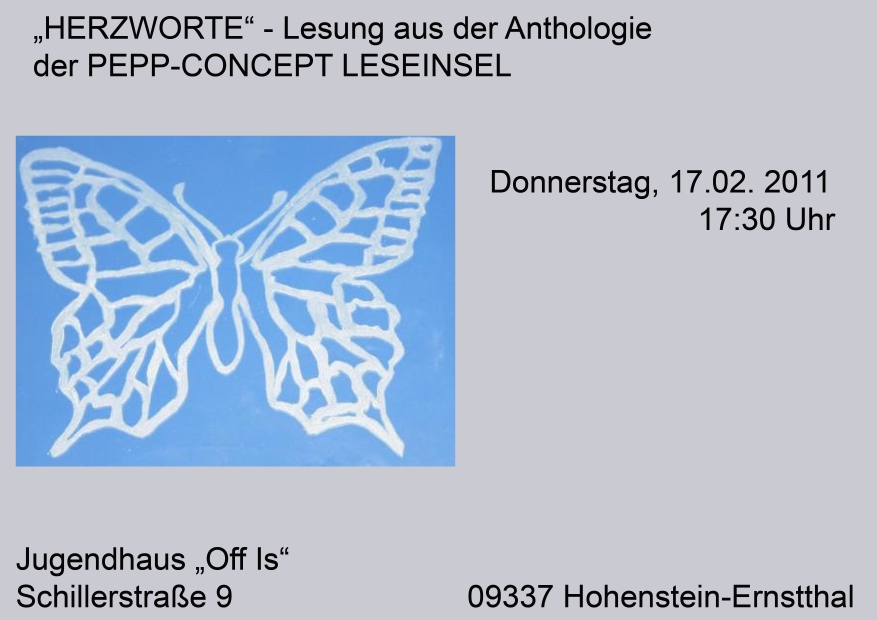 15. Februar 2011 #1 Die Leseinsel des Vereins "Pepp Concept" stellt ihr geplantes Anthologieprojekt "Herzworte" am 17.02. 2011 um 17:30 Uhr im Jugendhaus "Off Is" in 09337 Hohenstein Ernstthal vor. Der Eintritt ist frei