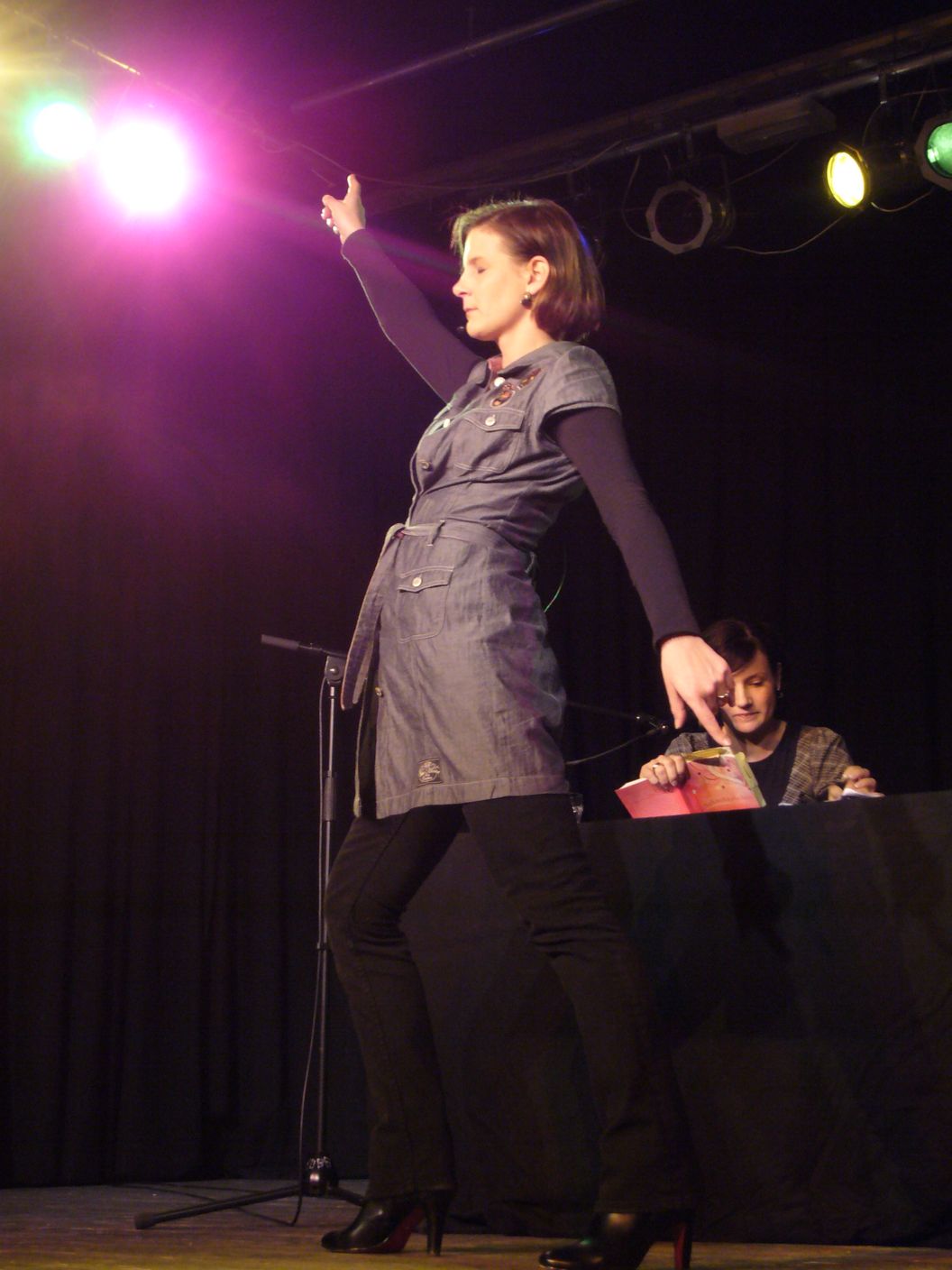 Nicht nur, dass die Lesung genial war, auch Wiebkes Showanlagen waren der Hammer :musik. Es gibt in den Anne Hertz-Romanen immer wieder Liedstücke, die Wiebke nun sehr exakt vortrug. Während Frauke mit Pompons auf ihrem Stuhl um sich schüttelte, sprang Wiebke mit einer Plastikgitarre vorne an den Rand der Bühne und legte los. Ich war erstaunt, dass sie so eine tolle Stimme hat. Diese Frau ist wirklich ein Multitalent und wäre sie nicht Schriftstellerin geworden, hätte sie Musik studiert (wie sie selber späte sagte). So folgte ein Joke dem anderen, ein Lied dem anderen und als nach der Pause, die Autorinnen noch aus ihren anderen Romanen vortrugen, gab auch hier Wiebke wieder ihr bestes und scheute sich noch nicht mal davor, ein „Blondchen“ auch gesanglich darzustellen.