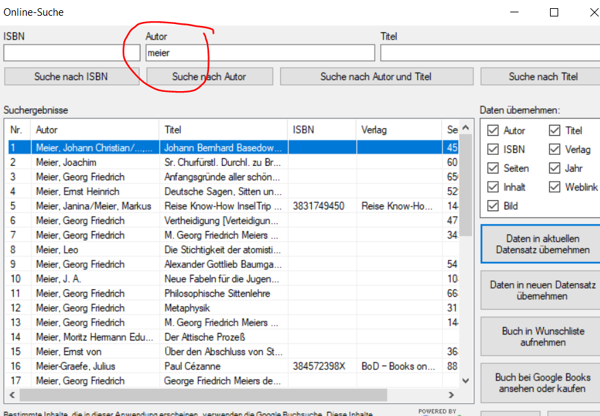 Danke für eure vielen Auskünfte hier. Hab mein Bookcook Classic heute aktualisiert und die Suche mit Google Books lief.
