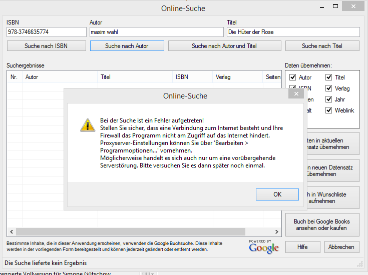 Und ich bekomme nach Suche mit ISBN oder Name diese Fehlermeldung... Habt ihr noch einen Rat für mich?? Langsam stapeln sich die einzutragenden Bücher, Hörbücher und ebooks.