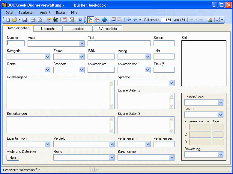 Zunächst klickt man das Buch, welches man übertragen will, in der Wunschliste an. Es wird dadurch markiert. In der Symbolleiste befindet sich eine Schaltfläche "Buch aus Wunschliste übernehmen". Klickt man diesen wird das Buch in einen neuen Buchdatensatz übernommen. Fehlende Informationen kann man nun noch ergänzen.