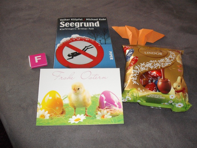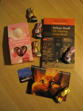 Ich habe Lakritzeulen von Katjes bekommen (von denen ich schon fleißig nasche), ein kleines Dekohäschen, das mit einem Schmetterling winkt, eine liebe Karte und folgendes Buch.