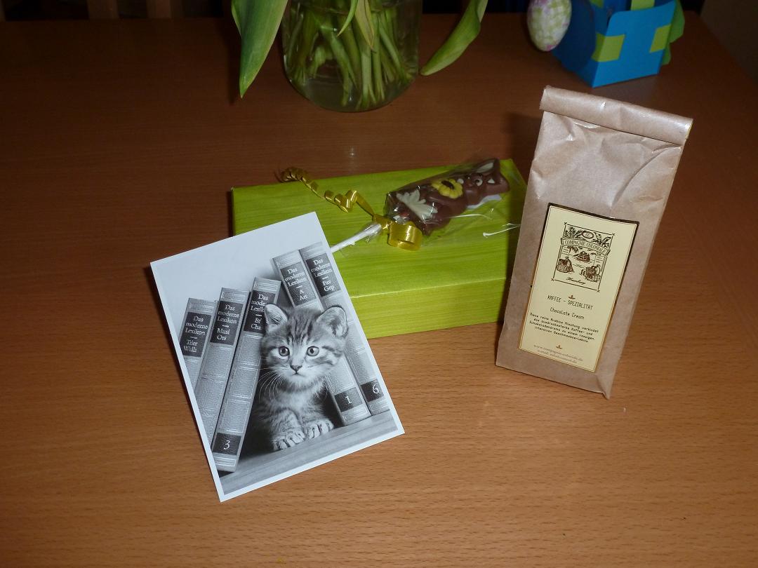 Ich habe Schokolade, eine Eulenkerze, eine nette Karte und natürlich ein Buch bekommen.