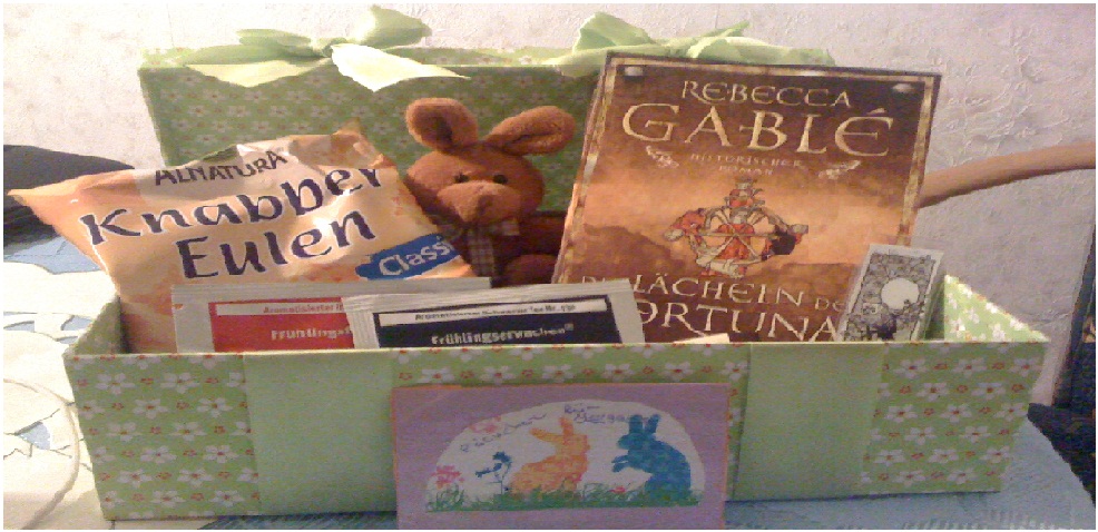 Ich habe Lakritzeulen von Katjes bekommen (von denen ich schon fleißig nasche), ein kleines Dekohäschen, das mit einem Schmetterling winkt, eine liebe Karte und folgendes Buch.