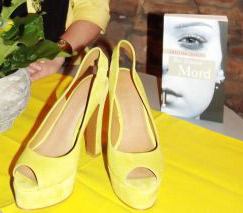 Ja, jetzt seht ihr alle, wie Lucys Schuhe aussehen. Die Farbe stimmt nich ganz; diese Schuhe sind eher zitronengelb. Aber ihr könnt euch sicher denken, wie überrascht ich war, als meine Freundin mir erzählte, dass sie sich solche Schuhe gekauft hatte und mir dann auch gleich anbot, sie für die Buchpremiere als Deko zu benutzen. Ich war aber wirklich froh, dass sie mir viel zu klein sind, sodass ich sie anziehen musste ;-).