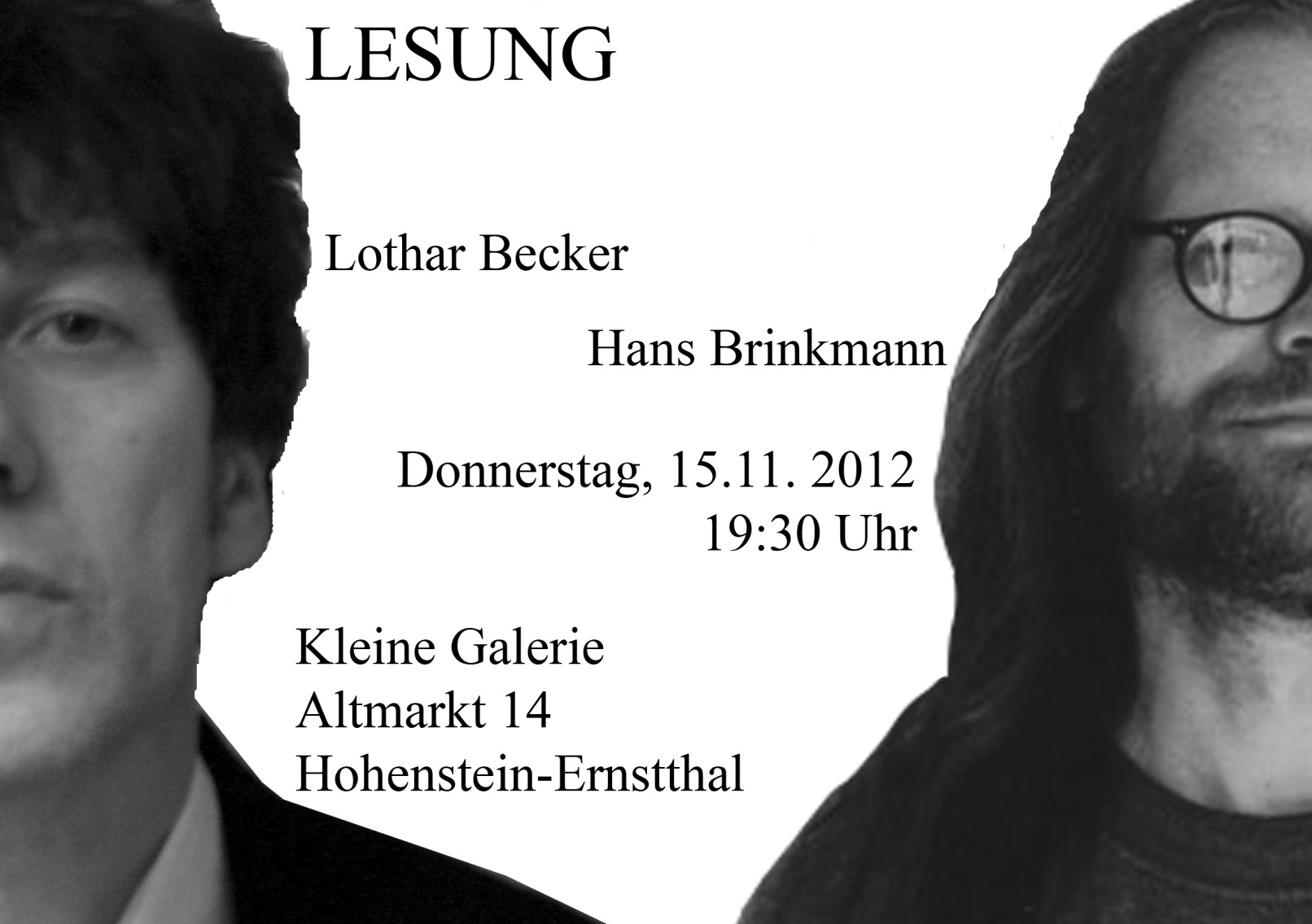 Am 15.11. 2012 um 19:30 Uhr findet in der Kleinen Galerie eine Lesung von Lothar Becker und Hans Brinkmann statt.