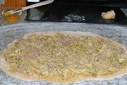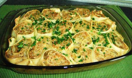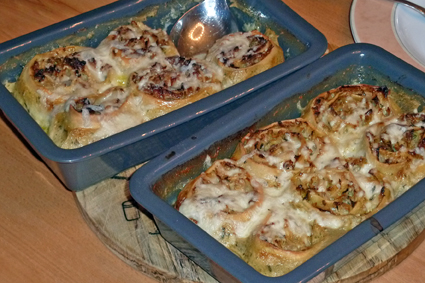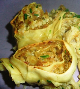 Eventuell werde ich beim nächsten Mal Hackfleisch mit in die Füllung geben, das sollte eigentlich auch gut passen und vielleicht krieg ich dann den ganzen Teig gefüllt ;-).