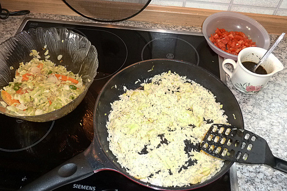 Das Gericht geht fix. Es bietet sich an, wenn man vom Vortag Reisreste übrig hat. Nur die Anzahl der Personen, die davon satt werden, ist mal wieder zu hoch gegriffen. Ich würde sagen, zwei Personen werden davon satt.