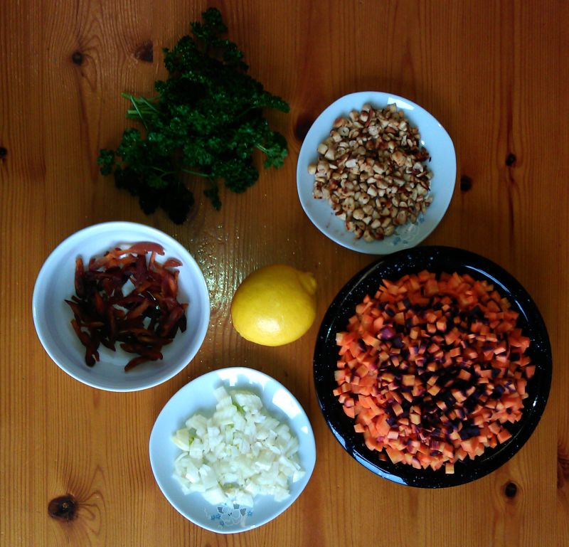 Dieses Mal habe ich es ein bisschen abgewandelt und zu einem Teil rote Möhren genommen und statt der Pinienkerne Cashewkerne (genauso lecker und günstiger im Preis!).