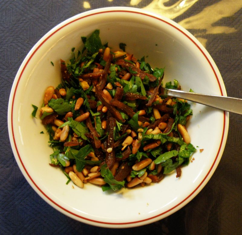 Vorallem die Aprikosen-Pinienkern-Petersilien-Mischung (ah: hier habe ich noch das Olivenöl weggelassen, das empfand ich irgendwie als überflüssig) zum Draufstreuen fanden alle superlecker. :anbet